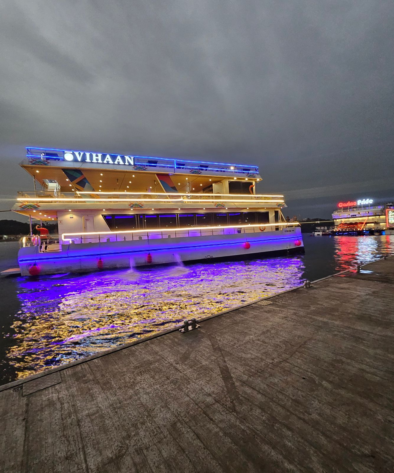 Experience Goa’s most romantic & premium night attraction — a luxury dinner cruise on the Mandovi River with live DJ, dance floor, buffet dinner, city lights, and casino views.